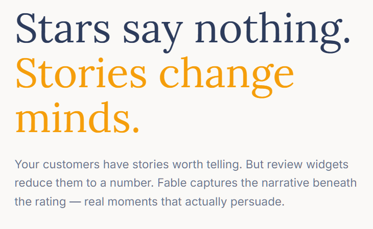 BEFORE: "Turn Customer Stories Into Revenue." Transactional. Stories exist to make money. AFTER: "Stars say nothing. Stories change minds." Philosophical. Challenges the star rating paradigm directly. The shift reframes what testimonials are for.